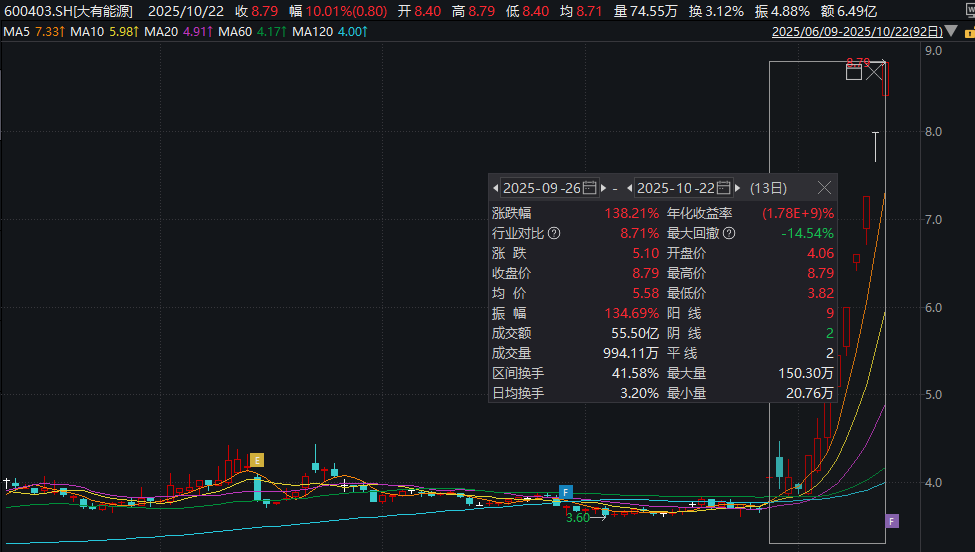 行情数据显示,今日,大有能源股价再次涨停,收报8.79元/股,总市值210亿元。自9月26日以来,公司股价持续上涨,在13个交易日里斩获了9个涨停板,累计涨幅近140%。