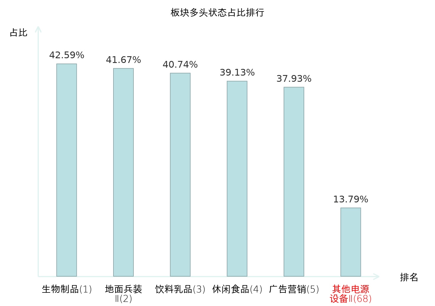 全市场所有行业板块中主力多头状态占比排名中,生物制品板块位居第一。黑色家电板块名次提升最快,较昨日上升65位。