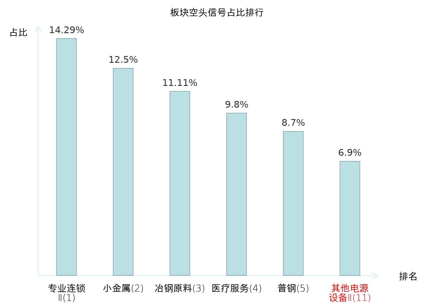 全市场所有行业板块中主力空头信号占比排名中,专业连锁Ⅱ板块位居第一。军工电子Ⅱ板块名次提升最快,较昨日上升106位。