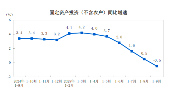 从9月当月来看,9月规模以上工业增加值同比增长6.5%,回升1.3个百分点,为3个月来最高水平;社会消费品零售总额同比增长3.0%,增速较8月回落0.4个百分点。1-9月,全国固定资产投资同比下降0.5%。