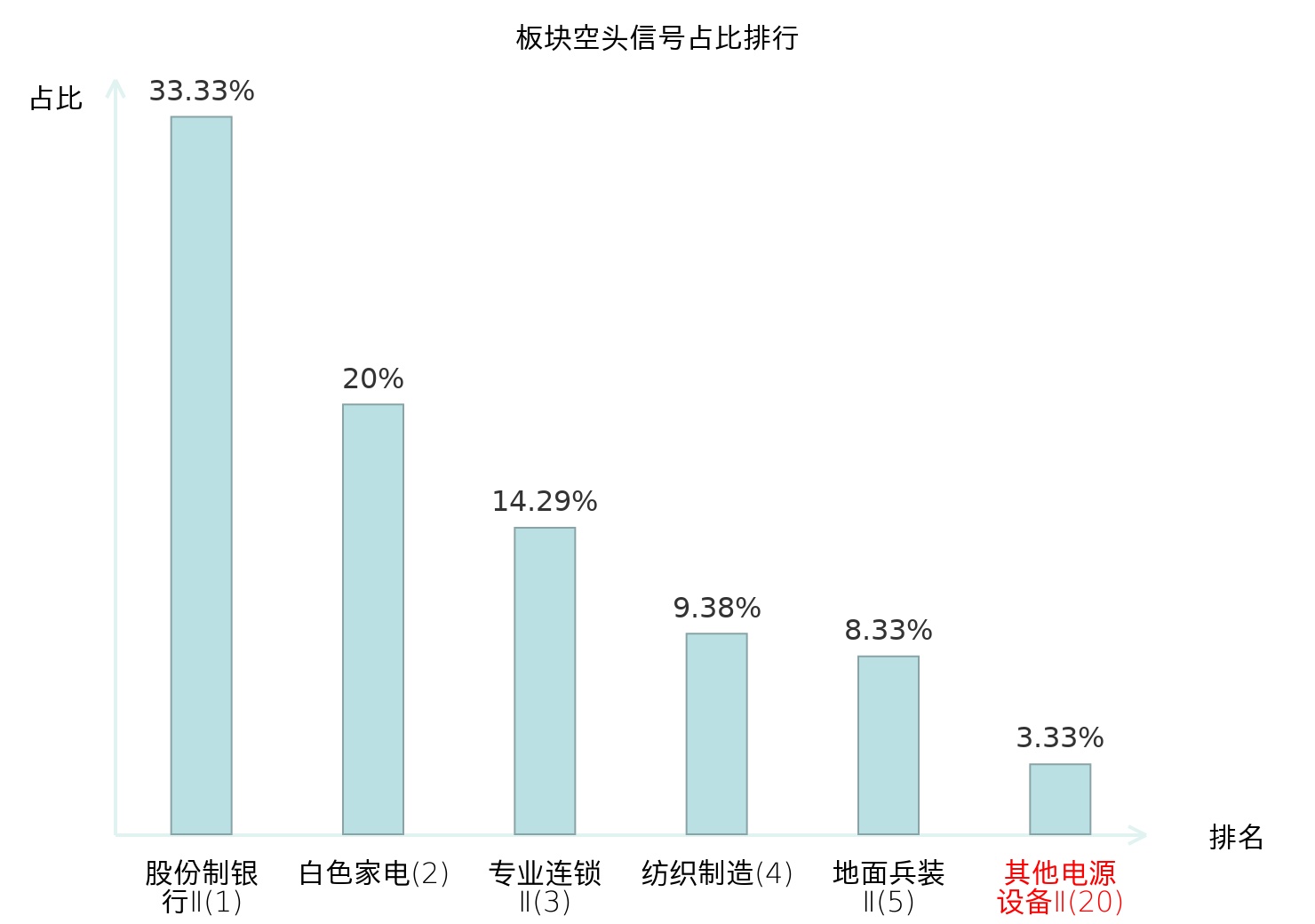 全市场所有行业板块中主力空头信号占比排名中,股份制银行Ⅱ板块位居第一。塑料板块名次提升最快,较昨日上升111位。