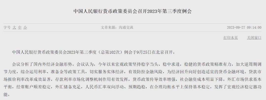 消息面上,9月27日,人民银行发布消息称,人民银行货币政策委员会2023年第三季度(总第102次)例会于25日在北京召开。