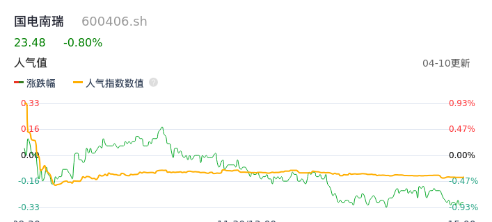 04月10日,国电南瑞收报23.48,股价涨幅-0.80%,成交金额3.04亿元,换手率0.16%。