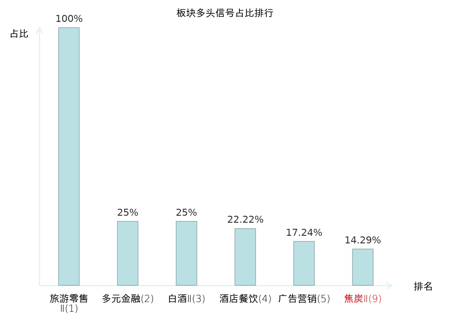 全市场所有行业板块中主力多头信号占比排名中,旅游零售Ⅱ板块位居第一。旅游零售Ⅱ板块名次提升最快,较昨日上升130位。