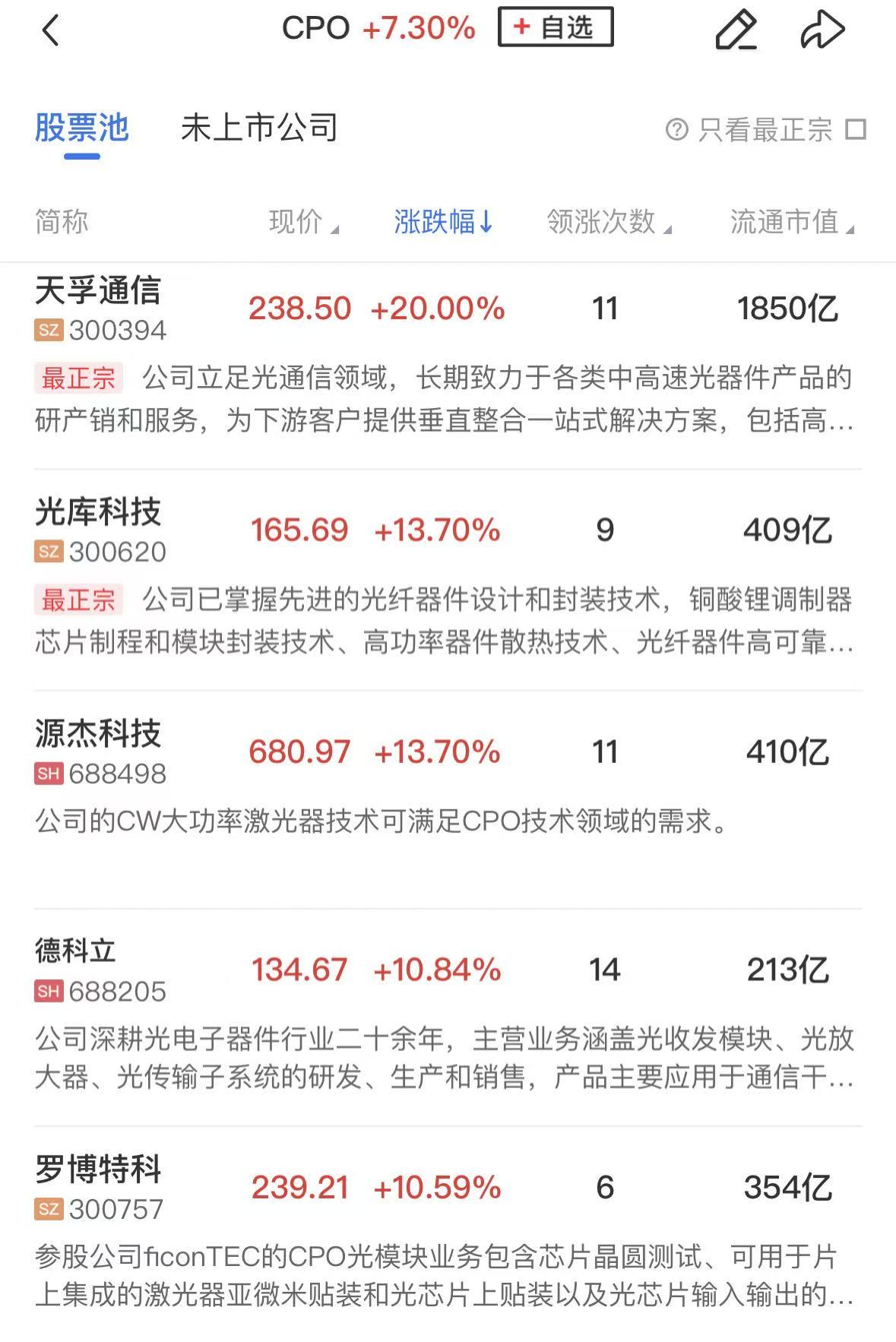 板块上,算力硬件方向涨幅居前,东田微、天孚通信双双20CM涨停,中际旭创涨超8%再创历史新高,致尚科技、光库科技、源杰科技、罗博特科等个股涨超10%。