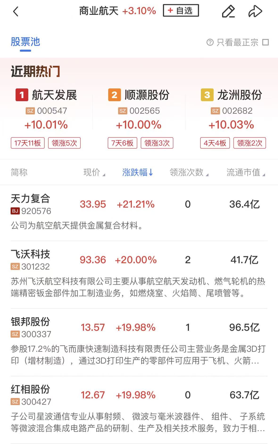 商业航天延续强势,飞沃科技、通宇通讯、顺灏股份、龙洲股份、天箭科技、航天科技等个股涨停。
