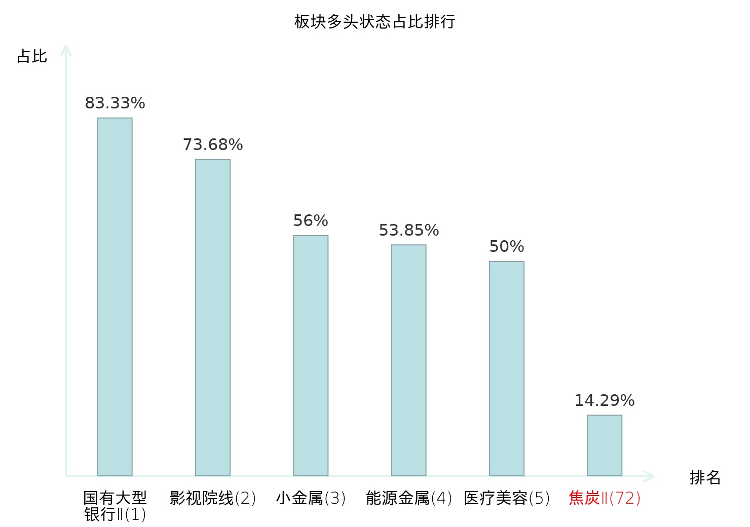 全市场所有行业板块中主力多头状态占比排名中,国有大型银行Ⅱ板块位居第一。电视广播Ⅱ板块名次提升最快,较昨日上升99位。