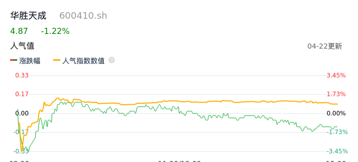 04月22日,华胜天成收报4.87,股价涨幅-1.22%,成交金额6688.59万元,换手率1.25%。