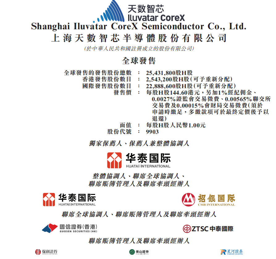 天数智芯此次计划发行25431800股H股。其中,香港公开发售2543200股,国际发售22888600股。以每股144.60港元的发行价计算,天数智芯此次募资额约为37亿港元,IPO市值将达354.42亿港元。