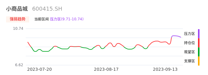 我们来看一下该股的九方特色指标强弱趋势的情况:小商品城近日从持仓区进入压力区。股价出现一波快速拉升行情,目前上升动能有所减弱。短期可能出现强势调整。