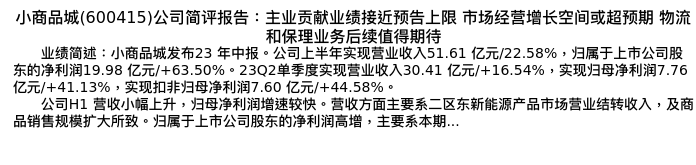 值得注意的是:2023年09月首创证券的李田分析师,首次发布关于小商品城的研究报告,标题为:小商品城(600415)公司简评报告:主业贡献业绩接近预告上限 市场经营增长空间或超预期 物流和保理业务后续值得期待。