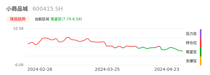 我们来看一下该股的九方特色指标强弱趋势的情况:小商品城自04月16日从持仓区下穿到观望区,股价近期持续走弱。短期已经进入空头行情,且下跌动能仍未衰竭。建议继续谨慎观望。