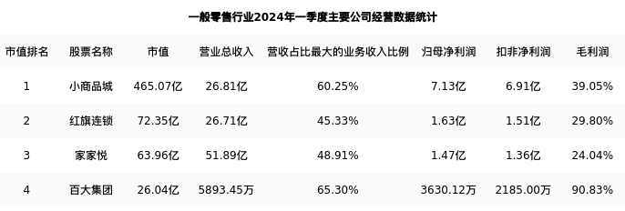 小商品城最新报告期数据为一季度,下表汇总了一般零售行业内市值靠前的公司一季度主要经营数据