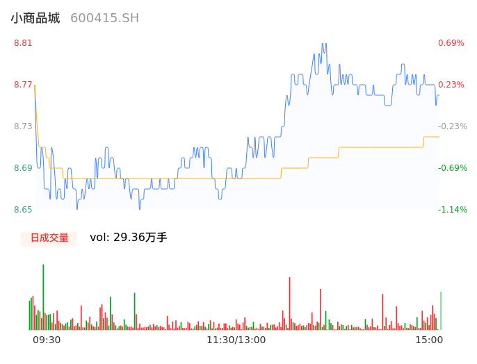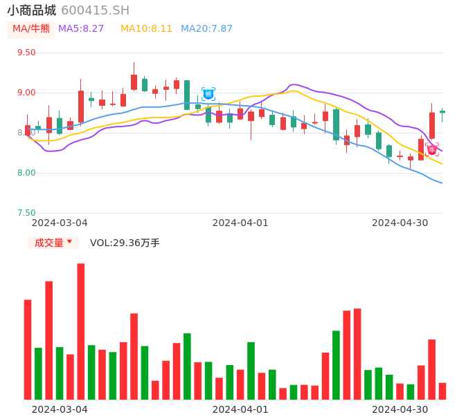 04月30日,小商品城收报8.75,股价涨幅0.00%,成交金额2.56亿元,换手率0.54%。