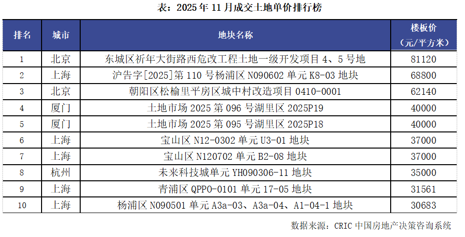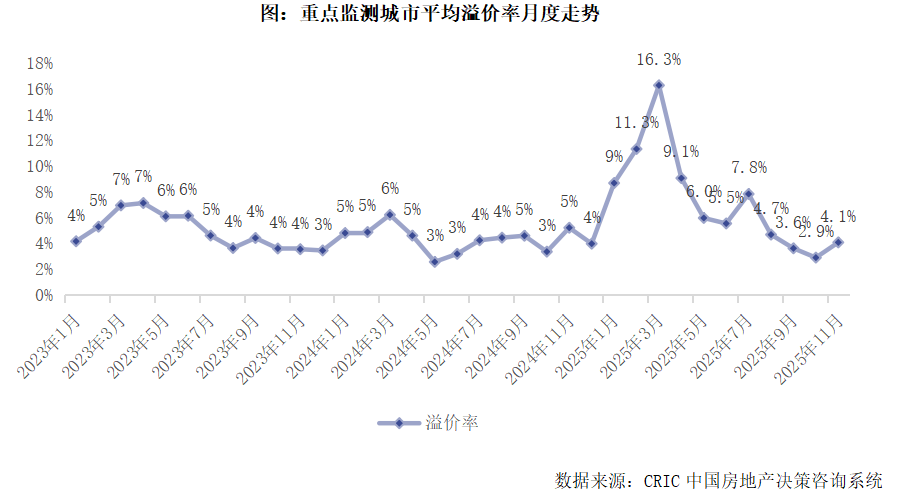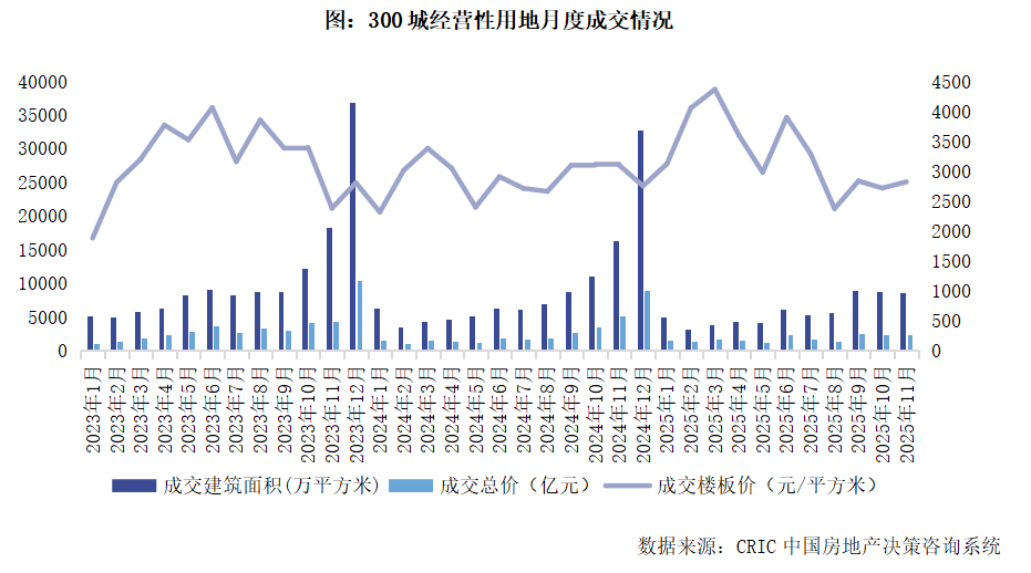热度:低位回升。11月平均溢价率为4.1%,环比上升1.29个百分点。土拍热度仍集中在少数城市的少数板块。本月杭州出让的3宗宅地均为底价成交,此前杭州2025年每个月都至少有2宗宅地溢价成交。