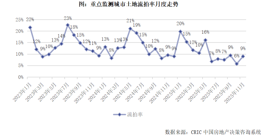 11月土地流拍率9%,仍在近年低位。具体来看,本月哈尔滨、福州、重庆、济南均有宅地流标或撤牌,或是位于重庆綦江区、福州闽侯县等远郊县区域,因未来销售前景确定性不足或未达出让预期,未能成功如期出让,或是因板块配套、地块规划未达市场预期,投资信心不足,如成都武侯区机投桥街道两宗宅地、佛山禅城区祖庙核心区宅地均未能如期出让。