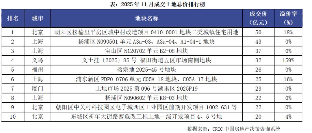 市场热度方面,至截稿时11月平均溢价率为4.1%,迎来低位回升。不过从个体项目来看,溢价成交仍零散分布在北京朝阳南磨房、上海浦东川沙、广州白云江高镇等少数板块,大多数地块仍以底价成交。在本月成交总价超过10亿元的31宗宅地中,仅北京和上海共4宗宅地溢价成交,其余均为底价成交。杭州本月出让的3宗宅地均为底价成交,而在此之前,2025年杭州每个月都至少有2宗宅地溢价成交。