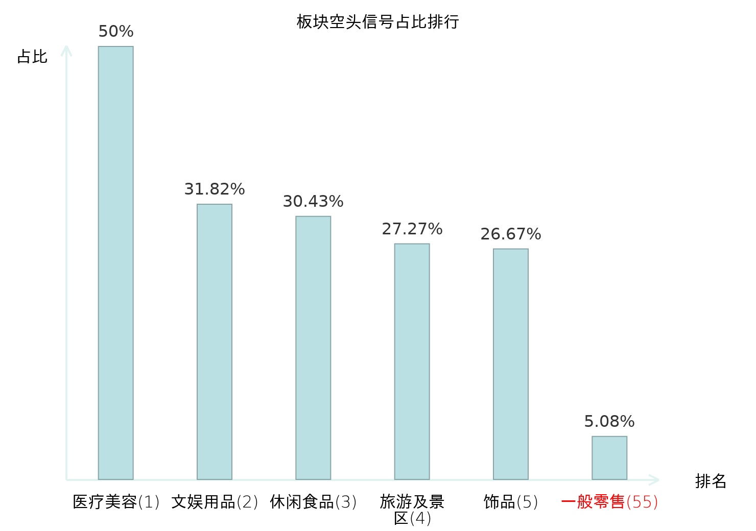 全市场所有行业板块中主力空头信号占比排名中,医疗美容板块位居第一。服装家纺板块名次提升最快,较昨日上升114位。