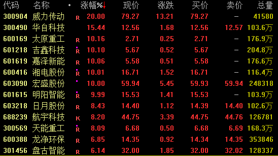 风电概念今日逆市上扬,截至收盘,威力传动20%涨停,华自科技涨超15%,太原重工、湘电股份、宏盛股份等均涨停。