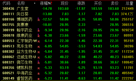 医药板块今日大幅下挫,截至收盘,广生堂跌近15%,向日葵、博瑞医药等跌超10%,奥赛康跌停,翰宇药业跌超9%,药明康德A股跌近4%。