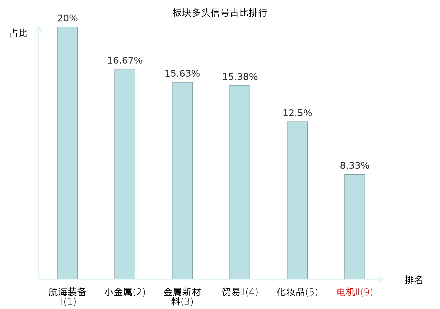 全市场所有行业板块中主力多头信号占比排名中,航海装备Ⅱ板块位居第一。航海装备Ⅱ板块名次提升最快,较昨日上升115位。