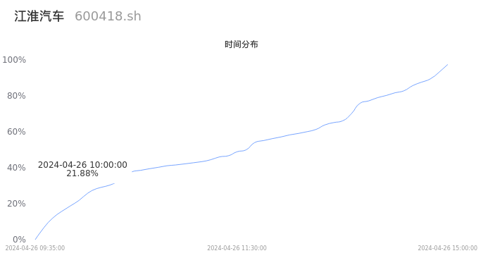 600418江淮汽车2024年04月26日成交96.37万手,成交金额15.75亿元,相较昨日放量45.64万手,换手率4.41%,成交清淡。