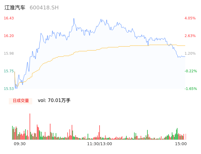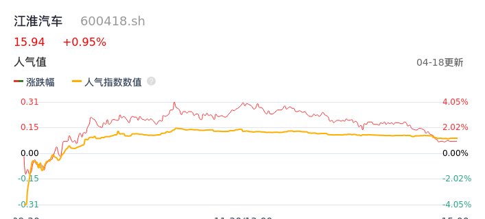 04月18日,江淮汽车收报15.94,股价涨幅0.95%,成交金额11.33亿元,换手率3.23%。