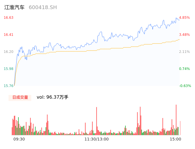 04月26日,江淮汽车收报16.60,股价涨幅4.67%,成交金额15.75亿元,换手率4.41%。
