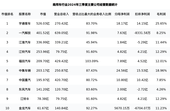 江淮汽车最新报告期数据为三季度,下表汇总了商用车行业内市值靠前的公司三季度主要经营数据