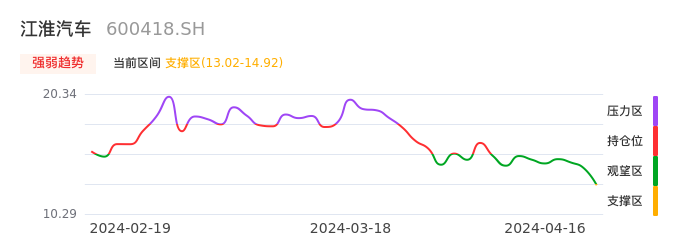 04月16日,江淮汽车收报14.84,股价涨幅-6.49%,成交金额12.70亿元,换手率3.84%。