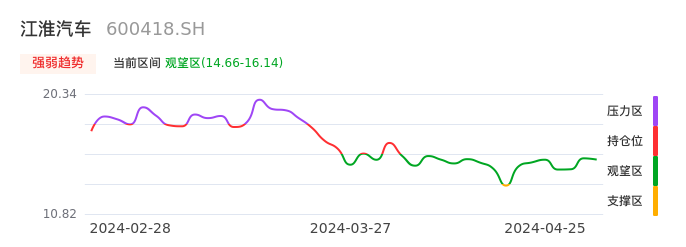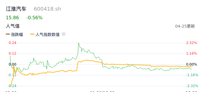 04月25日,江淮汽车收报15.86,股价涨幅-0.56%,成交金额8.11亿元,换手率2.32%。