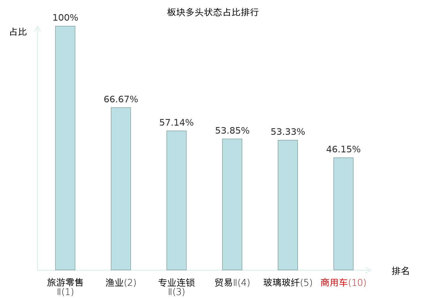 全市场所有行业板块中主力多头状态占比排名中,旅游零售Ⅱ板块位居第一。农业综合Ⅱ板块名次提升最快,较昨日上升83位。