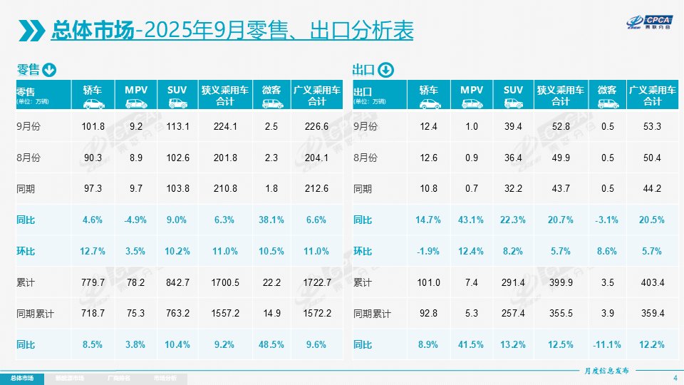 乘联分会:9月乘用车厂商零售、出口、批发和生产均创当月历史新高