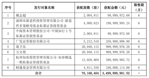 上证报中国证券网讯 江淮汽车晚间披露定增发行情况报告书,公司向姚志超、葛卫东等8名投资者合计发行了7016.84万股股份,发行价格为49.88元/股,募集资金总额为约35亿元。其中,私募大佬葛卫东耗资约10亿元认购了2004.81万股。本次向特定对象发行股票完成后,发行对象所认购的股份自发行结束之日起六个月内不得转让。