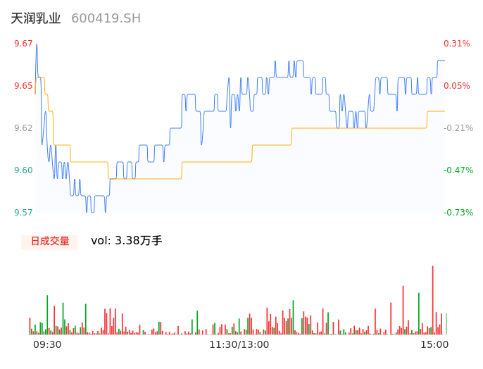 04月26日,天润乳业收报9.65,股价涨幅0.10%,成交金额3250.97万元,换手率1.05%。