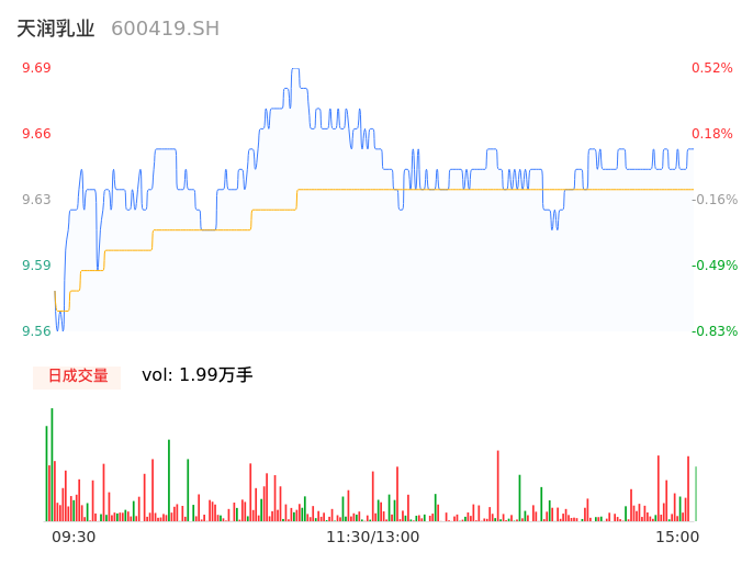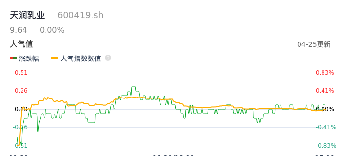 04月25日,天润乳业收报9.64,股价涨幅0.00%,成交金额1920.17万元,换手率0.62%。
