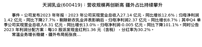 值得注意的是:2024年04月海通证券的颜慧菁/程碧升/张宇轩分析师,首次发布关于天润乳业的研究报告,标题为:天润乳业(600419):营收规模再创新高 疆外占比持续攀升。