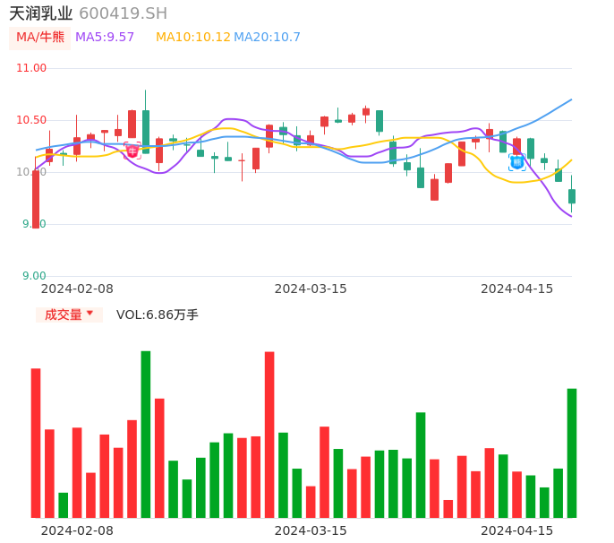 04月15日,天润乳业收报9.70,股价涨幅-2.12%,成交金额6704.07万元,换手率2.14%。