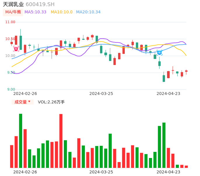 04月23日,天润乳业收报9.56,股价涨幅0.53%,成交金额2157.77万元,换手率0.71%。