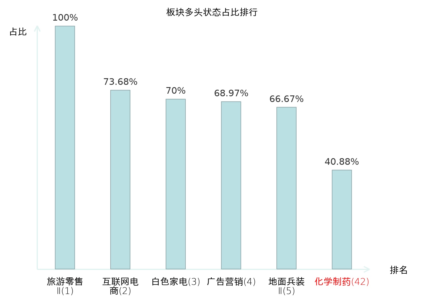 全市场所有行业板块中主力多头状态占比排名中,旅游零售Ⅱ板块位居第一。厨卫电器板块名次提升最快,较昨日上升76位。