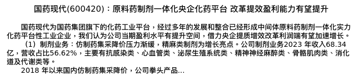 值得注意的是:2024年04月信达证券的唐爱金分析师,首次发布关于国药现代的研究报告,标题为:国药现代(600420):原料药制剂一体化央企化药平台 改革提效盈利能力有望提升。
