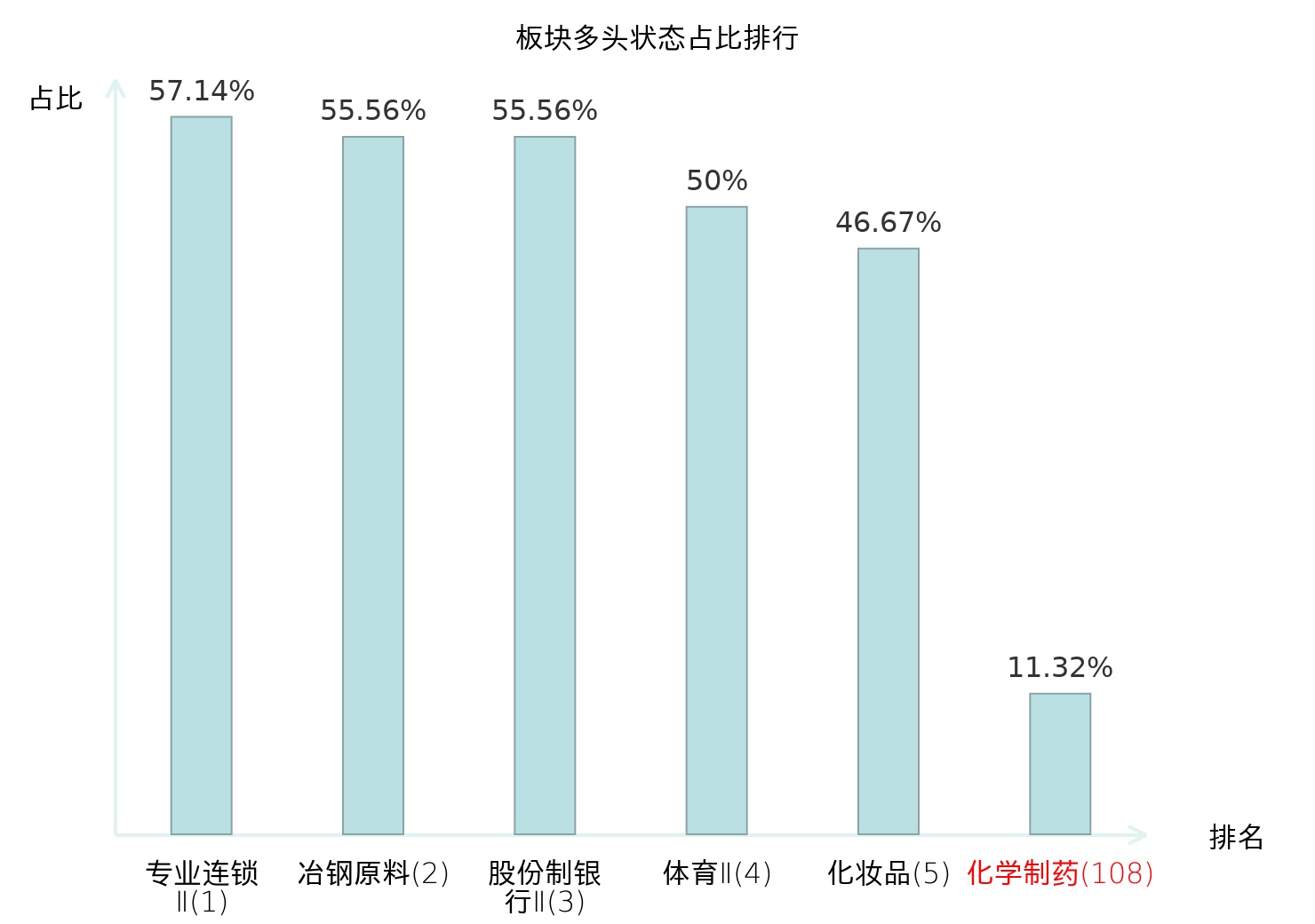全市场所有行业板块中主力多头状态占比排名中,专业连锁Ⅱ板块位居第一。乘用车板块名次提升最快,较昨日上升85位。