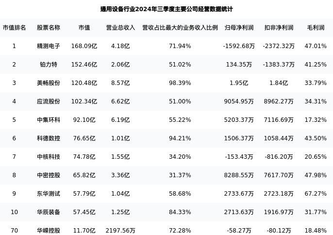 华嵘控股最新报告期数据为三季度,下表汇总了通用设备行业内市值靠前的公司三季度主要经营数据