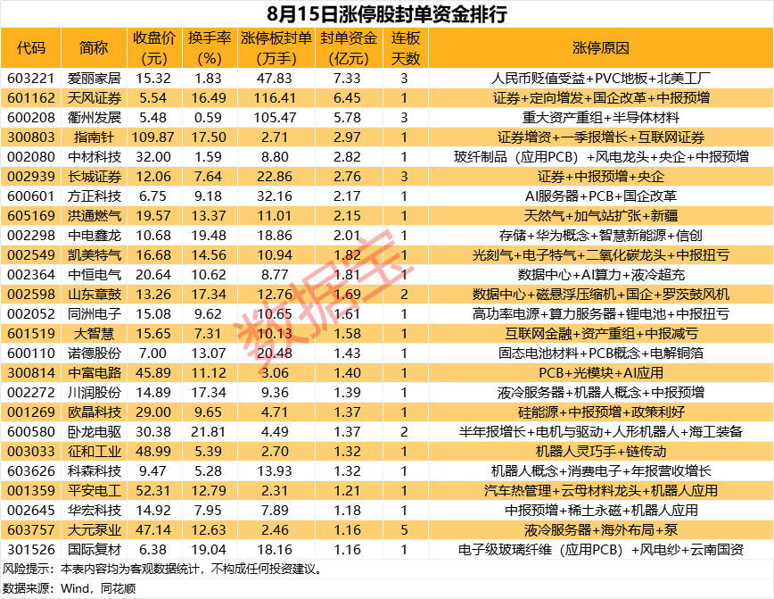 以封单金额计算,31股封单资金超1亿元,爱丽家居、天风证券、衢州发展封单资金居前,分别为7.33亿元、6.45亿元、5.78亿元。