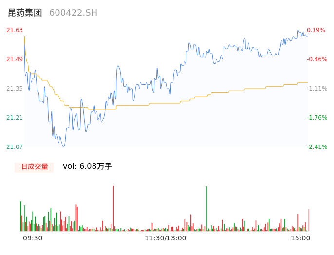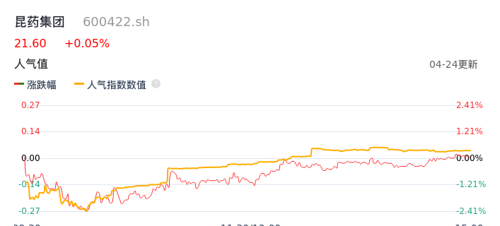 04月24日,昆药集团收报21.60,股价涨幅0.05%,成交金额1.30亿元,换手率0.80%。