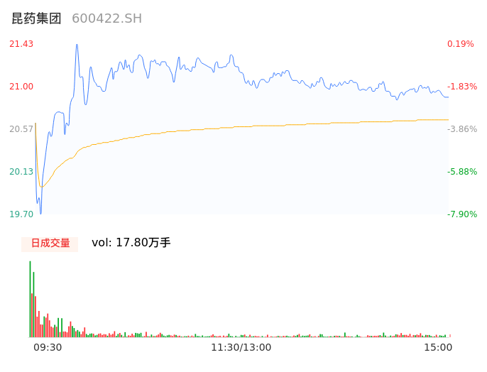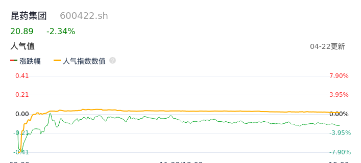 04月22日,昆药集团收报20.89,股价涨幅-2.34%,成交金额3.68亿元,换手率2.35%。