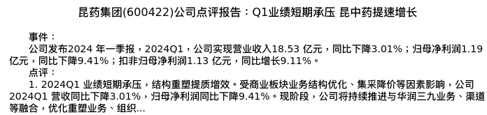 值得注意的是:2024年04月方正证券的周超泽分析师,首次发布关于昆药集团的研究报告,标题为:昆药集团(600422)公司点评报告:Q1业绩短期承压 昆中药提速增长。