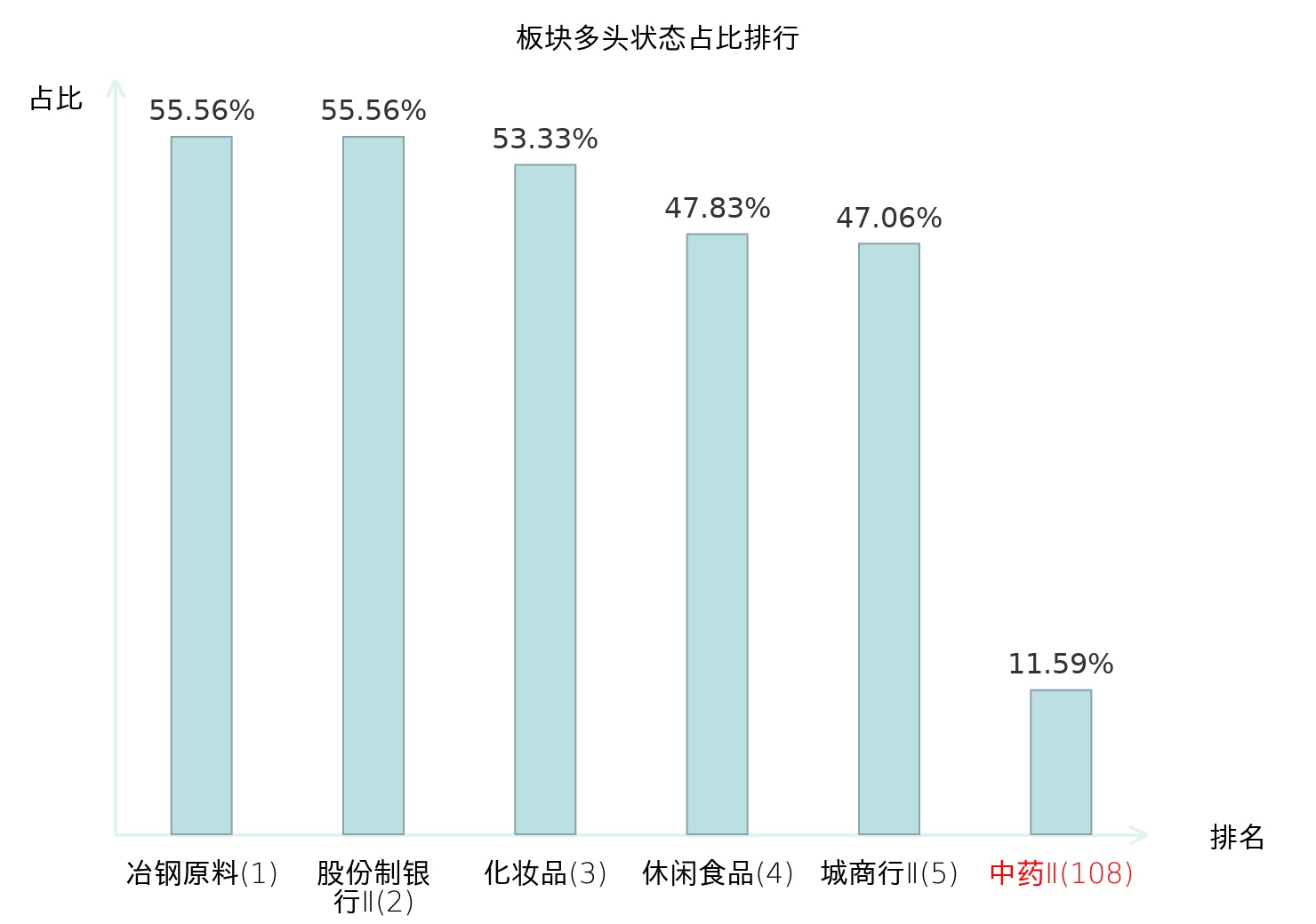 全市场所有行业板块中主力多头状态占比排名中,冶钢原料板块位居第一。其他家电Ⅱ板块名次提升最快,较昨日上升105位。