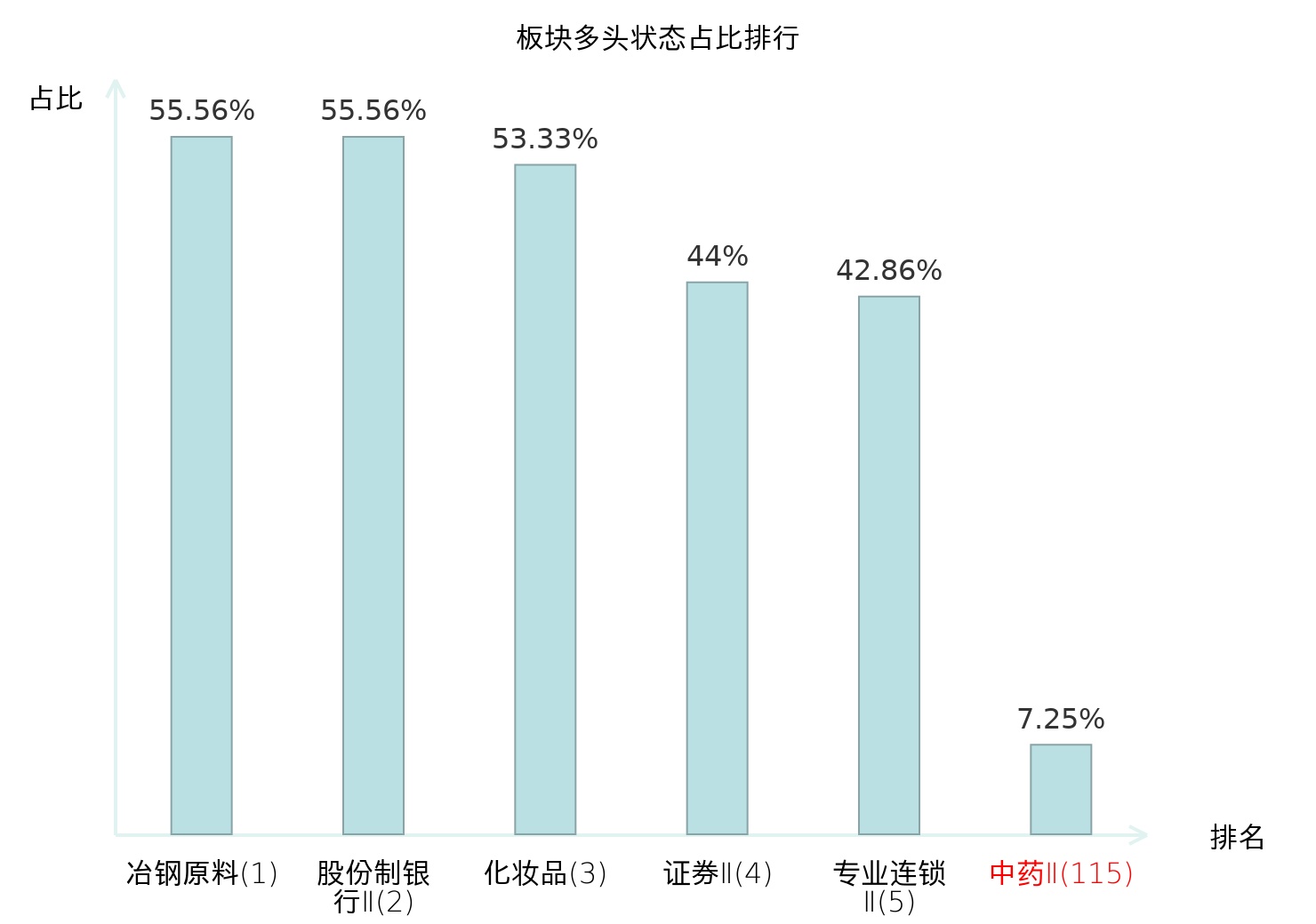 全市场所有行业板块中主力多头状态占比排名中,冶钢原料板块位居第一。保险Ⅱ板块名次提升最快,较昨日上升114位。
