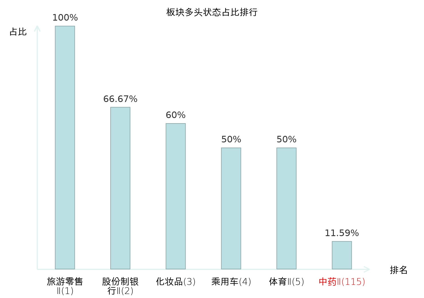 全市场所有行业板块中主力多头状态占比排名中,旅游零售Ⅱ板块位居第一。旅游零售Ⅱ板块名次提升最快,较昨日上升130位。